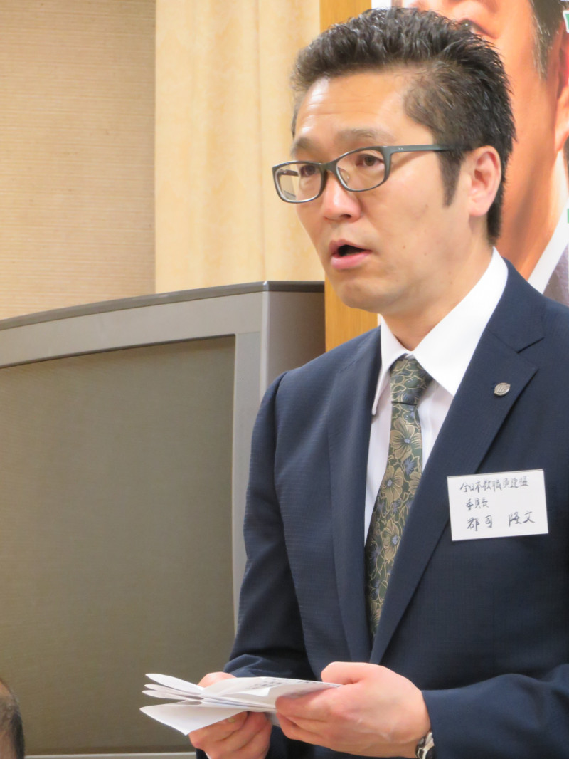 中尾建三理事長は「北朝鮮がきょう早朝からミサイルを試射し、非常に緊迫した状況だ。米政権が不安定で北朝鮮、中国、ロシア、韓国など日本を取り巻く国際情勢は厳しさを増している。参議院で『テロ等準備罪』いわゆる“共謀罪”法案が審議入りしたが、もっと大変重要な内容を審議すべきなのに森友学園や加計学園をめぐる問題で野党が揚げ足取りばかりしている。国家百年の大計である教育問題をどうしていくか、役員会、総会で論議を重ねていきたい」と述べました。